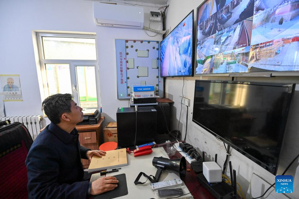 Zhang Yufei watches monitors in Faxing Temple in Zhangzi County, north China's Shanxi Province, March 12, 2024. Faxing Temple, with a history of more than 1,000 years, is nestled on Cuiyun Mountain of Zhangzi County. In 1988, the temple was listed as a national key cultural relics protection site. (Xinhua/Yang Chenguang)