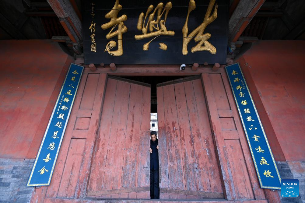 Zhang Yufei opens the gate of Faxing Temple in Zhangzi County, north China's Shanxi Province, March 16, 2024. Faxing Temple, with a history of more than 1,000 years, is nestled on Cuiyun Mountain of Zhangzi County. In 1988, the temple was listed as a national key cultural relics protection site. (Xinhua/Yang Chenguang)