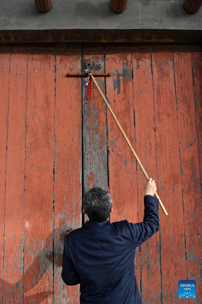 Zhang Yufei unlocks a gate with his home-made tool in Faxing Temple in Zhangzi County, north China's Shanxi Province, March 16, 2024. Faxing Temple, with a history of more than 1,000 years, is nestled on Cuiyun Mountain of Zhangzi County. In 1988, the temple was listed as a national key cultural relics protection site. (Xinhua/Yang Chenguang)