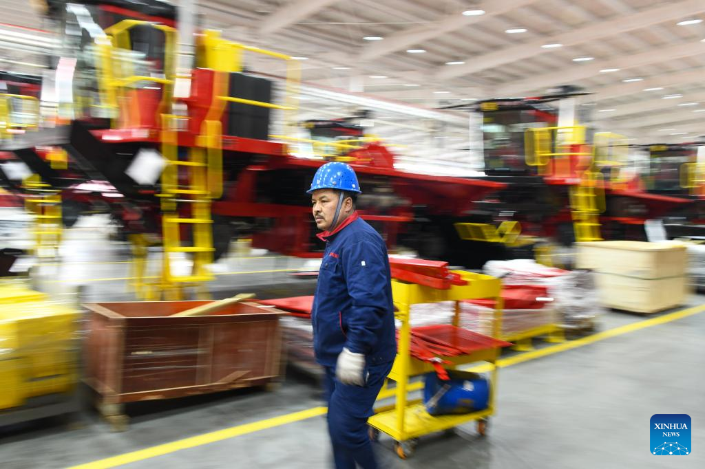Amatjan Mamat works at a cotton harvester factory in Wusu, northwest China's Xinjiang Uygur Autonomous Region, Feb. 28, 2024. (Xinhua/Zhao Ge)