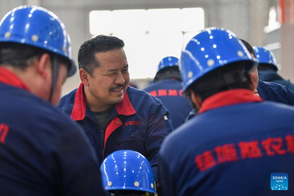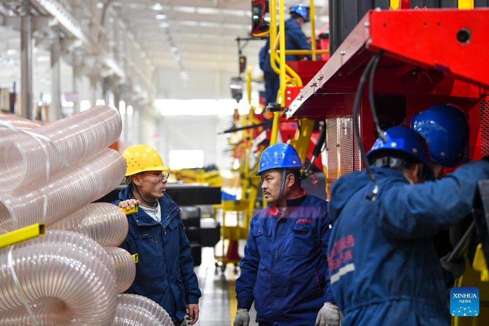 Amatjan Mamat (2nd L) works at a cotton harvester factory in Wusu, northwest China's Xinjiang Uygur Autonomous Region, Feb. 28, 2024. (Xinhua/Zhao Ge)