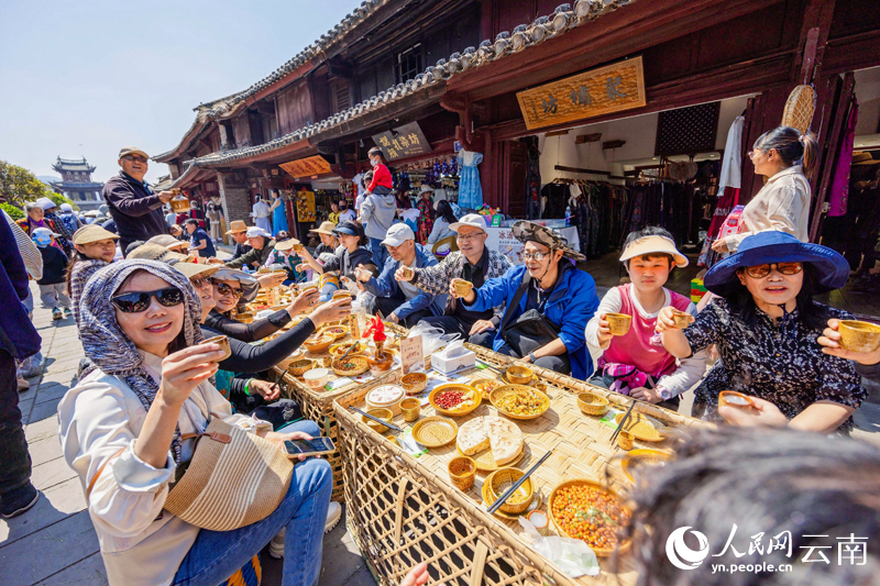 On March 16, a long-table banquet was held along a street in Weishan. A total of 169 tables were arranged in a row, creating a beautiful sight resembling a blooming flower. Tourists from various places came together to enjoy the feast.