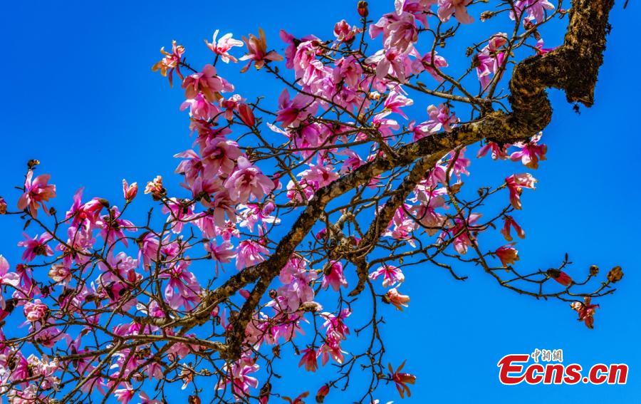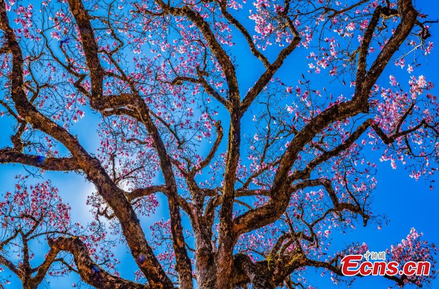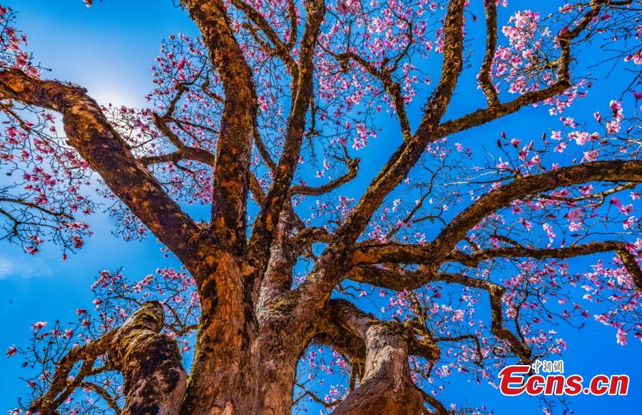 A magnolia tree with a history of more than 600 years blossoms with pink flowers in Shimian County of Ya'an City, southwest China's Sichuan Province. (Photo: China News Service/Zhou Wanlong)