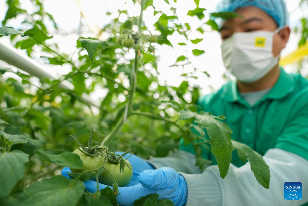 A bee is seen on the leaves of tomato plants at a greenhouse of a smart agriculture industrial park in Jiamusi, northeast China's Heilongjiang Province, March 18, 2024. The city of Jiamusi is taking advantage of greenhouse to boost agricultural production efficiency. (Xinhua/Wang Jianwei)