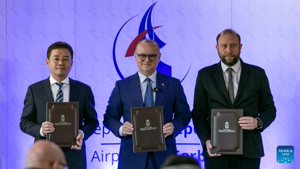Director of China Shandong International Economic & Technical Cooperation Group Zhuang Yong (L), Serbian Minister of Construction, Transport and Infrastructure Goran Vesic (C), and Acting Director of "Aerodromi Srbije" (Airports of Serbia) Mihajlo Zdravkovic show the contract for expansion of Serbia's Konstantin Veliki Airport in Nis, southeastern Serbia, on March 19, 2024. Serbia's Konstantin Veliki Airport in the southeast city of Nis is set for expansion after an infrastructure development contract was awarded to China's Shandong Hi-Speed Group on Tuesday. (Photo by Wang Wei/Xinhua)