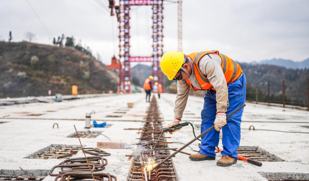 A worker works at the construction site of Baishuihe bridge on Nayong-Qinglong Expressway in southwest China's Guizhou Province, March 19, 2024. The Baishuihe bridge, with a length of 833.5 meters, has completed the bridge deck installation recently. (Xinhua/Tao Liang)