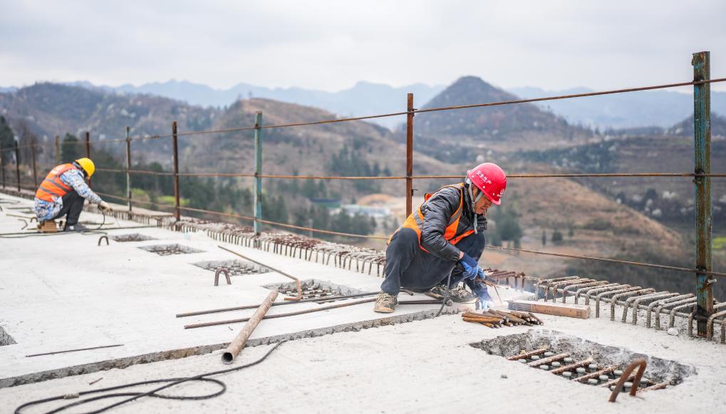 Workers work at the construction site of Baishuihe bridge on Nayong-Qinglong Expressway in southwest China's Guizhou Province, March 19, 2024. The Baishuihe bridge, with a length of 833.5 meters, has completed the bridge deck installation recently. (Xinhua/Tao Liang)