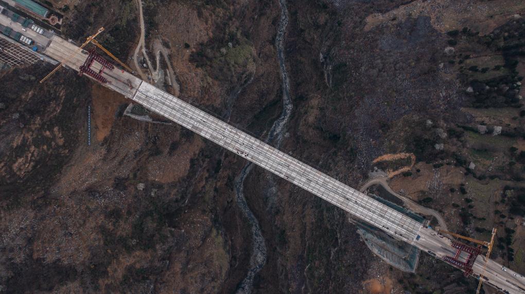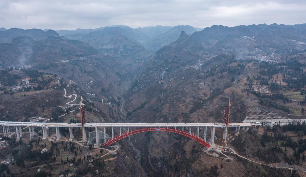 An aerial drone photo taken on March 19, 2024 shows the construction site of Baishuihe bridge on Nayong-Qinglong Expressway in southwest China's Guizhou Province. The Baishuihe bridge, with a length of 833.5 meters, has completed the bridge deck installation recently. (Xinhua/Tao Liang)