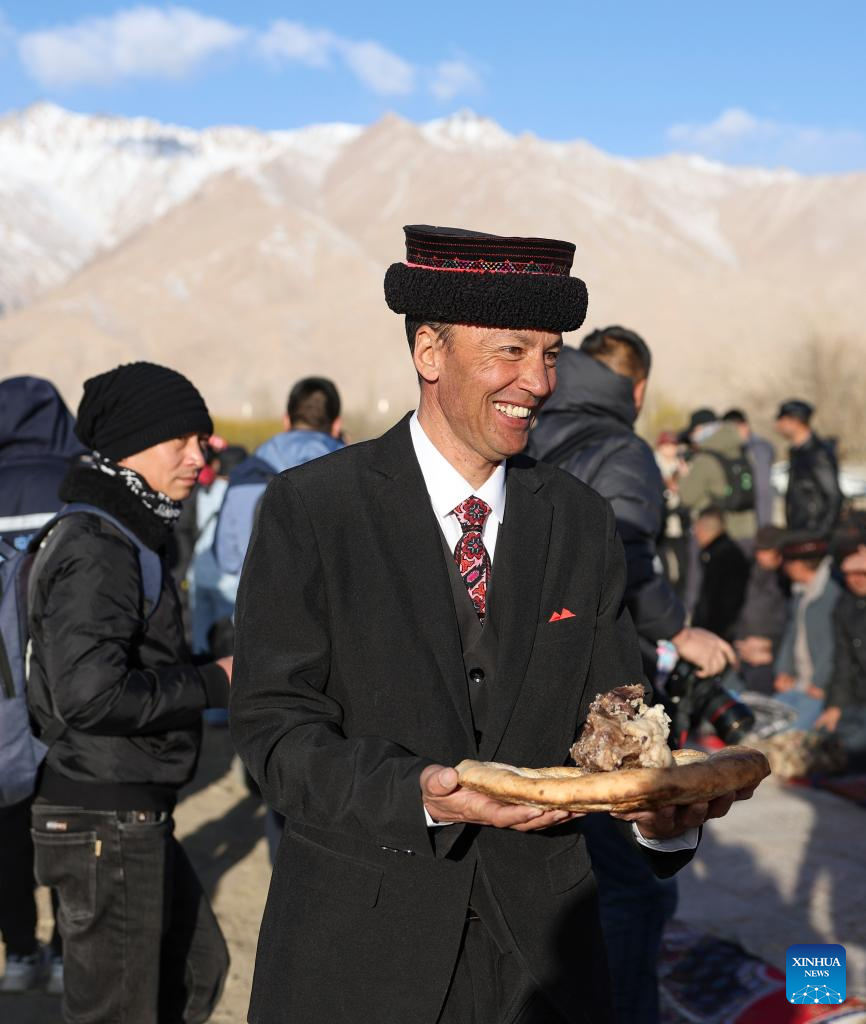 A resident holds food in Warxidi village of Taxkorgan Tajik Autonomous County, northwest China's Xinjiang Uygur Autonomous Region, March 19, 2024. People in Taxkorgan Tajik Autonomous County celebrated their traditional sowing festival and drawing water festival on Tuesday. Marking the beginning of sowing seeds and drawing water, the festivals includes ceremonies to invoke good luck and good harvest. The festivals were also included in the state intangible cultural heritage list. (Xinhua/Hu Huhu)