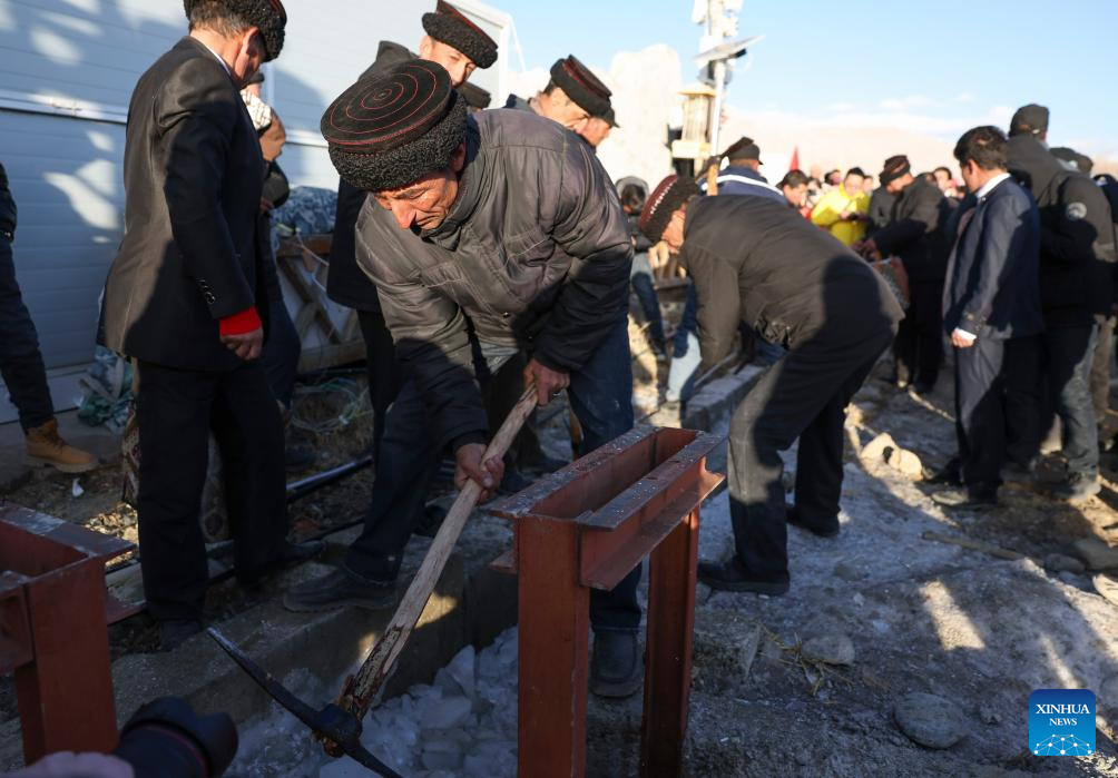 Residents break the ice and draw water in Warxidi village of Taxkorgan Tajik Autonomous County, northwest China's Xinjiang Uygur Autonomous Region, March 19, 2024. People in Taxkorgan Tajik Autonomous County celebrated their traditional sowing festival and drawing water festival on Tuesday. Marking the beginning of sowing seeds and drawing water, the festivals includes ceremonies to invoke good luck and good harvest. The festivals were also included in the state intangible cultural heritage list. (Xinhua/Hu Huhu)