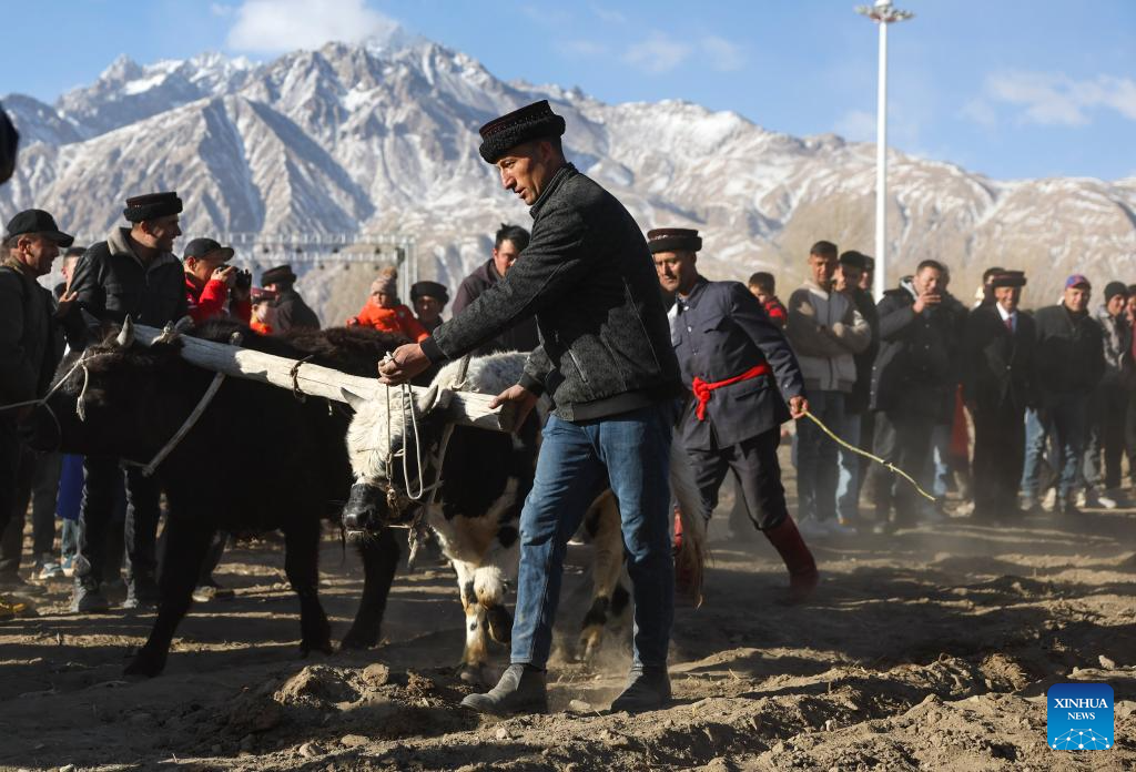 Residents show traditional ploughing skills in Warxidi village of Taxkorgan Tajik Autonomous County, northwest China's Xinjiang Uygur Autonomous Region, March 19, 2024. People in Taxkorgan Tajik Autonomous County celebrated their traditional sowing festival and drawing water festival on Tuesday. Marking the beginning of sowing seeds and drawing water, the festivals includes ceremonies to invoke good luck and good harvest. The festivals were also included in the state intangible cultural heritage list. (Xinhua/Hu Huhu)