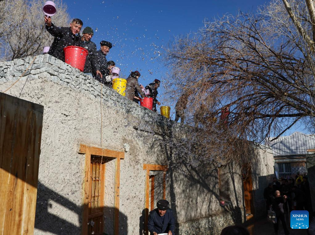 People spray water to guests for good luck in Warxidi village of Taxkorgan Tajik Autonomous County, northwest China's Xinjiang Uygur Autonomous Region, March 19, 2024. People in Taxkorgan Tajik Autonomous County celebrated their traditional sowing festival and drawing water festival on Tuesday. Marking the beginning of sowing seeds and drawing water, the festivals includes ceremonies to invoke good luck and good harvest. The festivals were also included in the state intangible cultural heritage list. (Xinhua/Hu Huhu)