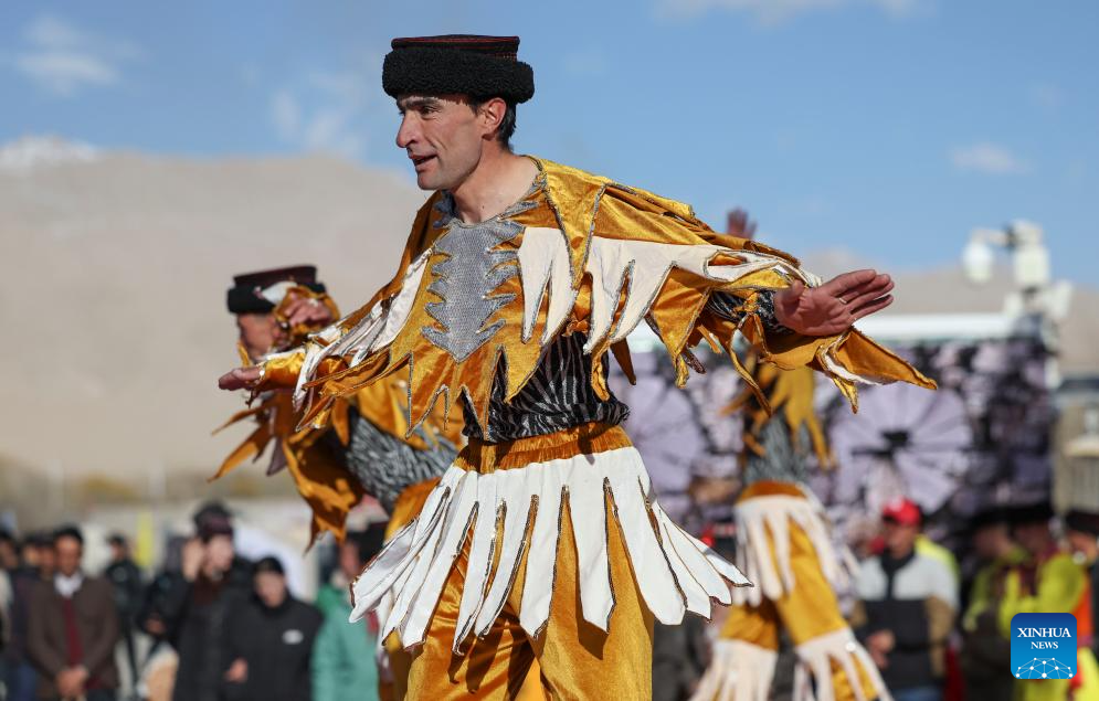 A resident performs a typical tajik dance which imitates the flight of the eagle in Warxidi village of Taxkorgan Tajik Autonomous County, northwest China's Xinjiang Uygur Autonomous Region, March 19, 2024. People in Taxkorgan Tajik Autonomous County celebrated their traditional sowing festival and drawing water festival on Tuesday. Marking the beginning of sowing seeds and drawing water, the festivals includes ceremonies to invoke good luck and good harvest. The festivals were also included in the state intangible cultural heritage list. (Xinhua/Hu Huhu)