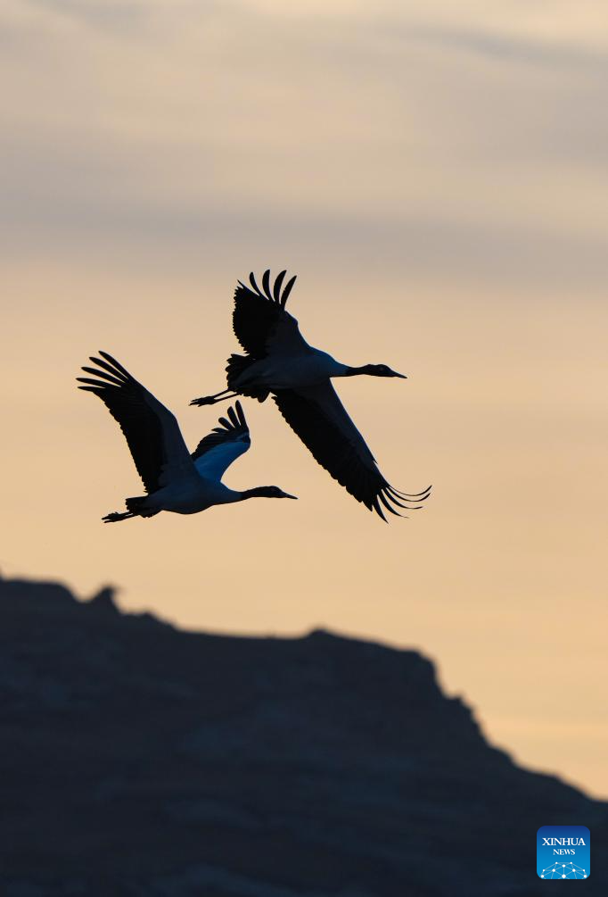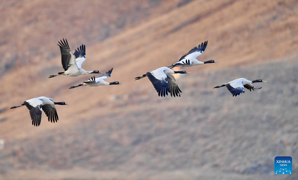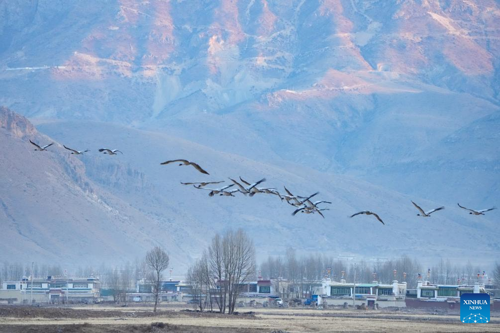 Black-necked cranes fly at a reservoir in Lhunzhub County of Lhasa, southwest China's Xizang Autonomous Region, March 17, 2024. As the temperature gradually rises, black-necked cranes have started their migration from the reservoir in Lhunzhub County. The black-necked crane, a species under first-class state protection in China, mainly inhabits plateau meadows and marshes at an altitude of 2,500 to 5,000 meters. (Xinhua/Zhang Rufeng)