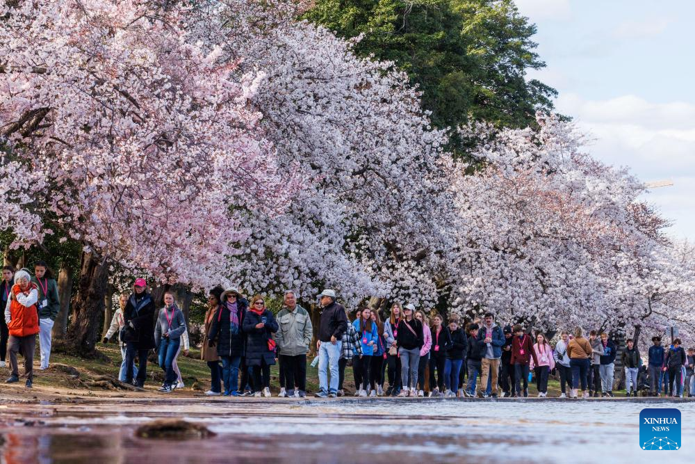 People walk under cherry blossoms at the Tidal Basin in Washington, D.C., the United States, March 18, 2024. (Photo by Aaron Schwartz/Xinhua)
