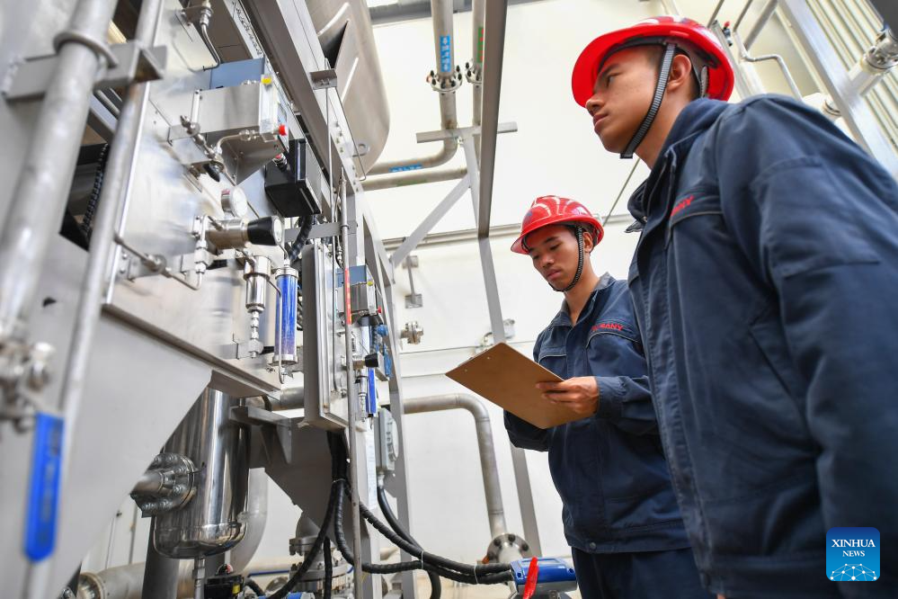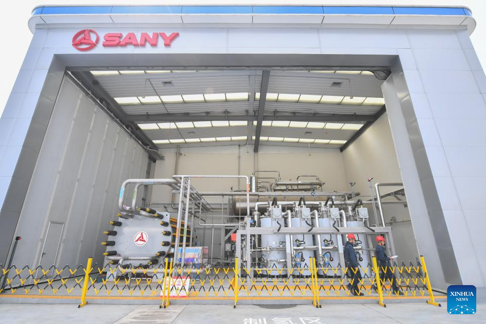 Staff workers inspect hydrogen production area at the hydrogen production and distribution station of Sany Group in Changsha, capital of central China's Hunan Province, March 20, 2024. (Xinhua/Chen Zeguo)