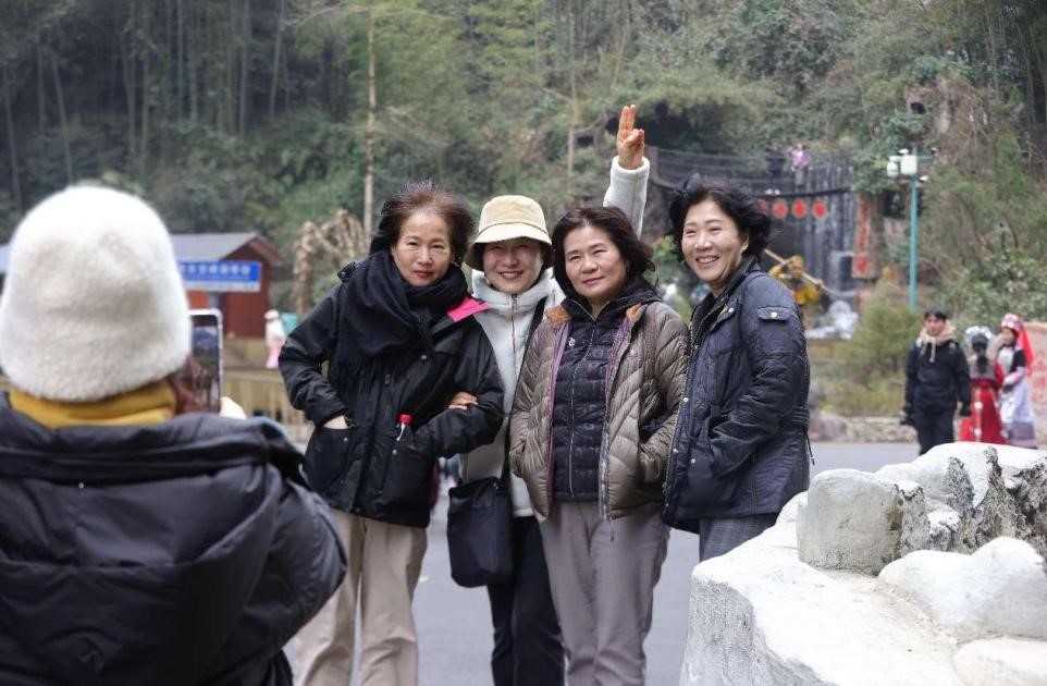 South Korean tourists pose for a picture in a scenic area in Zhangjiajie, central China's Hunan province, Feb. 29, 2024. (People's Daily Online/Wu Yongbing)