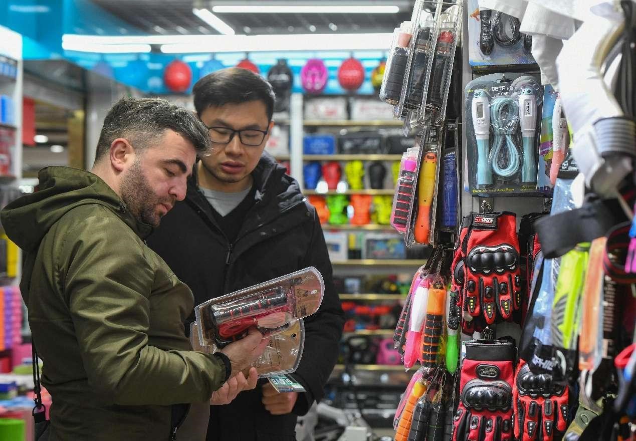 A merchant from Georgia purchases sports equipment at the Yiwu International Trade Market in east China's Zhejiang province. (People's Daily Online/Shi Kuanbing)