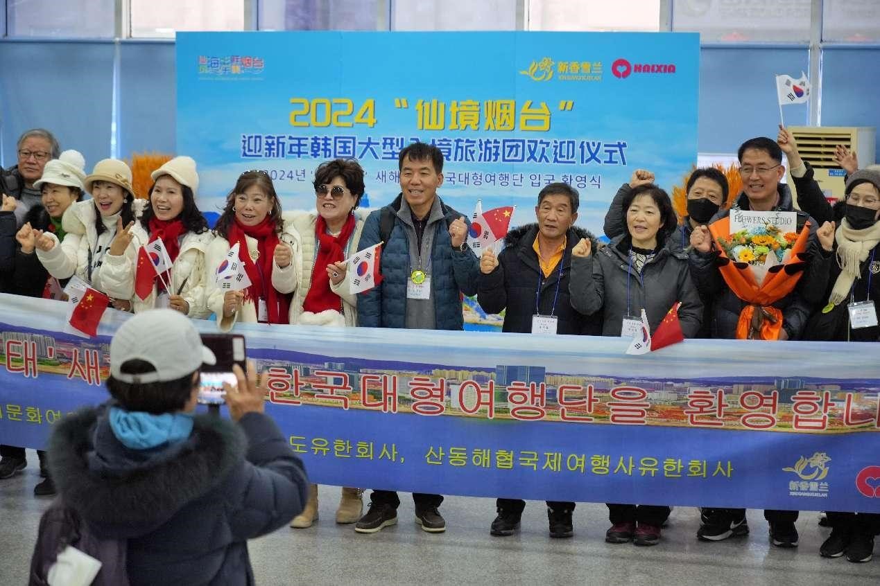 South Korean tourists pose for a picture at the Yantai Port in east China's Shandong province, Dec. 31, 2023. (People's Daily Online/Tang Ke)