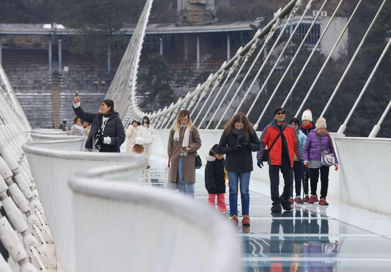 Foreign tourists walk on a glass-bottomed bridge at Zhangjiajie Grand Canyon, central China's Hunan province. (People's Daily Online/Wu Yongbing)
