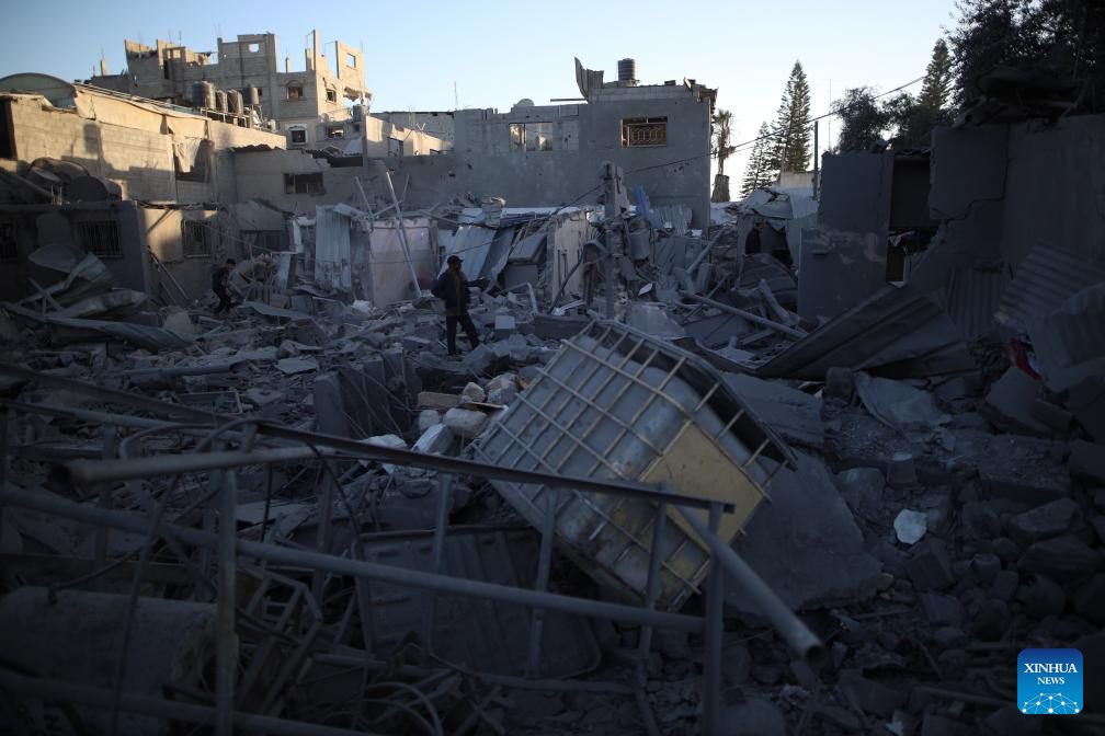 People stand on the rubble after an Israeli airstrike in Maghazi refugee camp, central Gaza Strip, on March 21, 2024. The death toll from ongoing Israeli attacks on the Gaza Strip has risen to 31,988, the Hamas-run Ministry of Health in Gaza announced Thursday. (Xinhua)