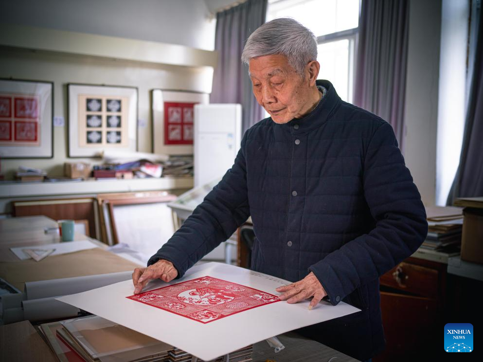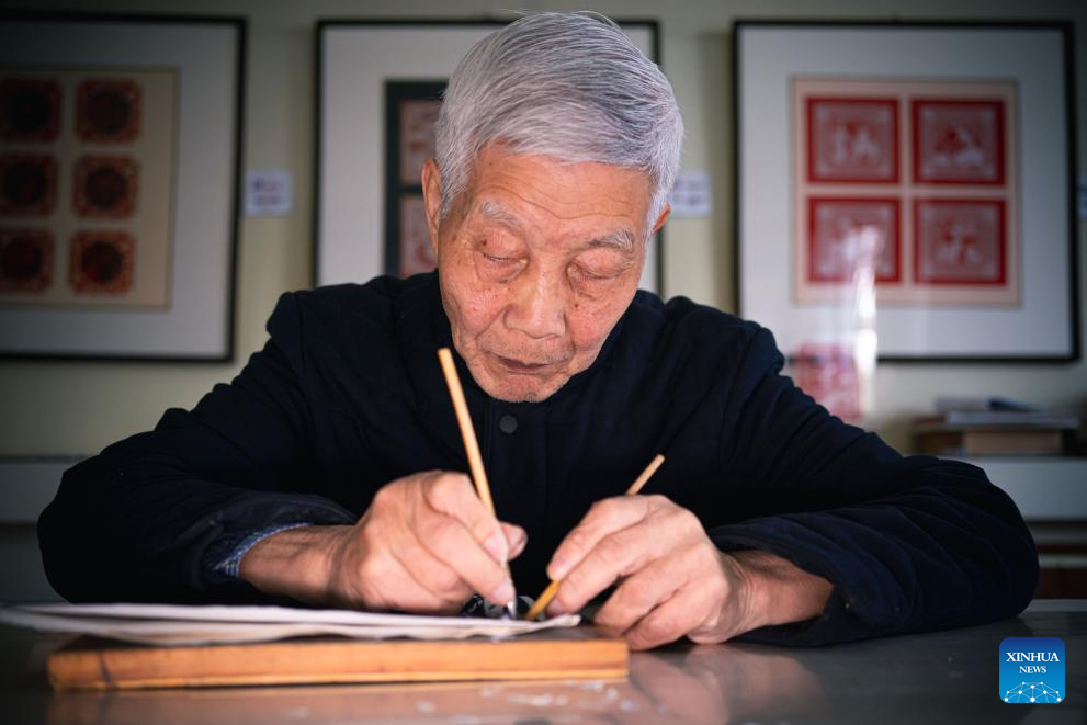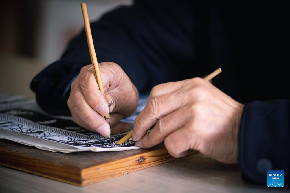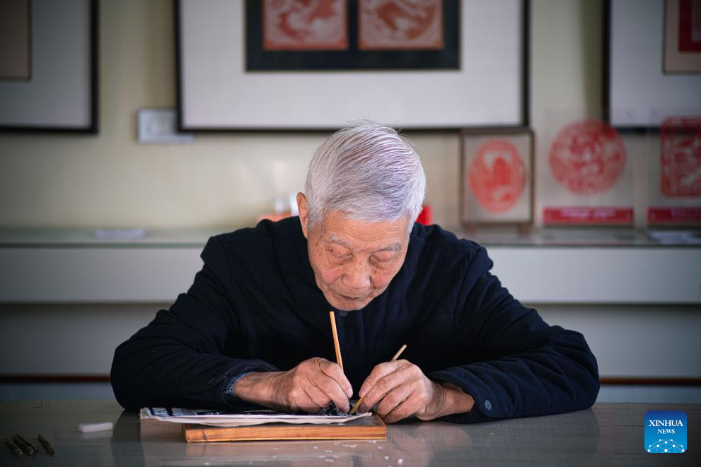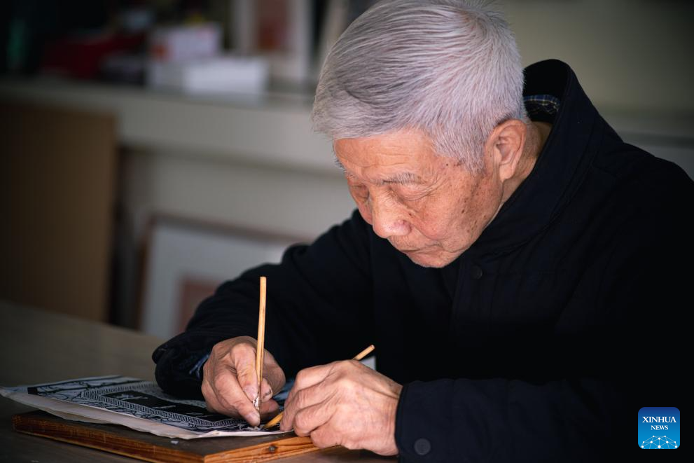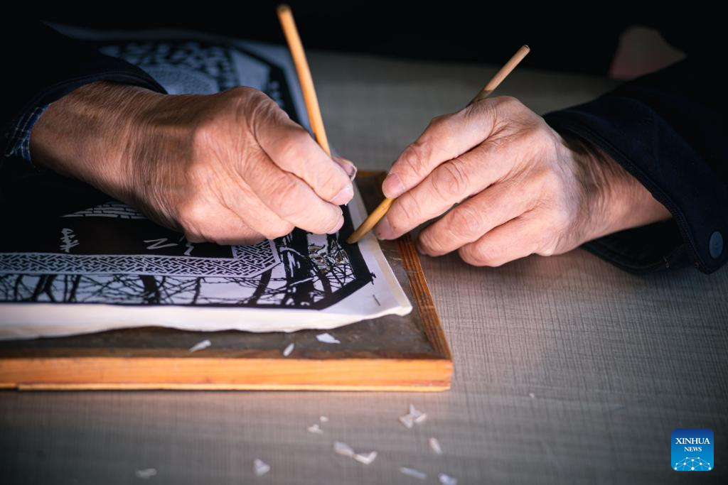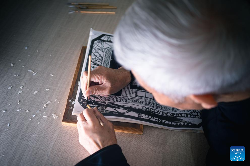 Lu Faliang mounts a paper knife cutting at his studio in Yueqing City, east China's Zhejiang Province, March 12, 2024.(Xinhua/Jiang Han)