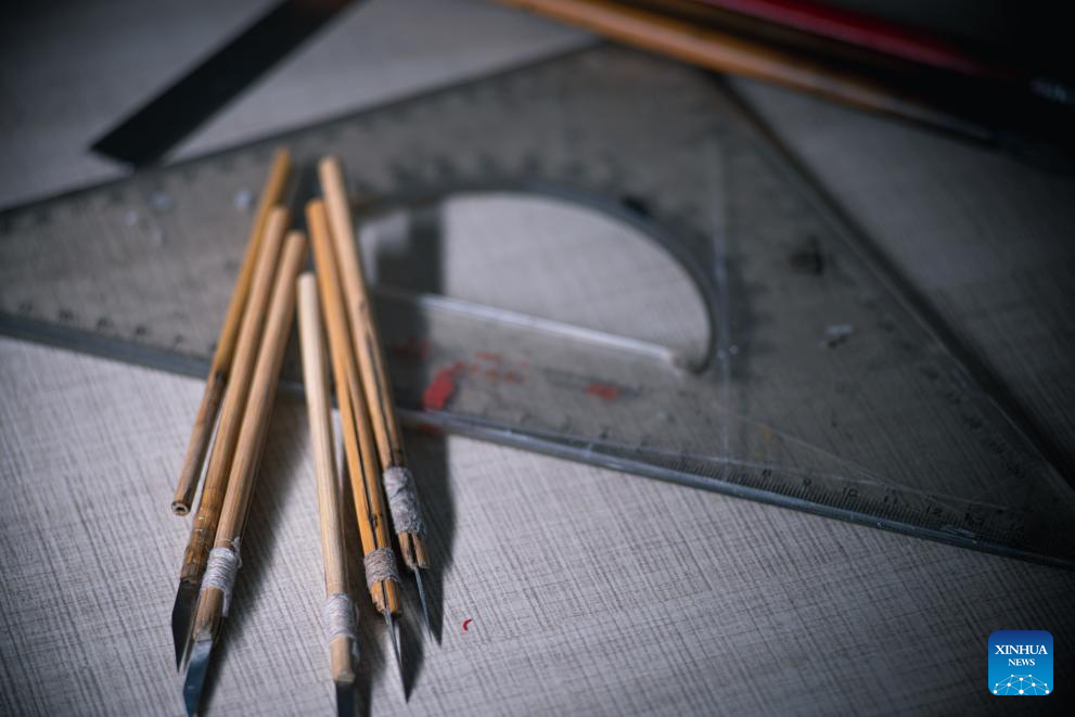 This photo taken on March 12, 2024 shows tools that Lu Faliang uses for making paper knife cuttings in Yueqing City, east China's Zhejiang Province.(Xinhua/Jiang Han)