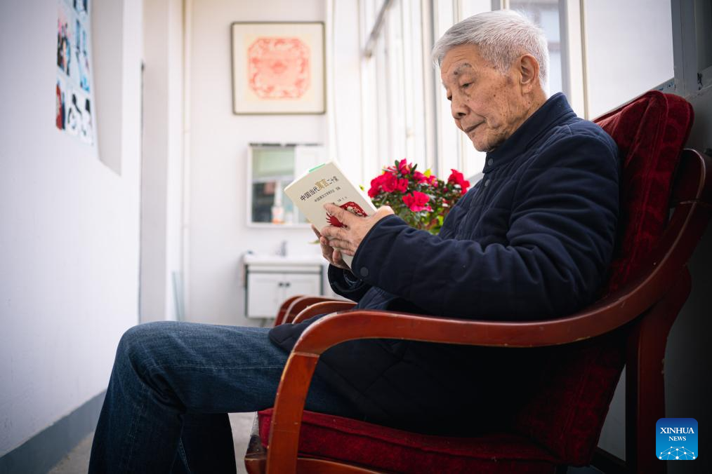 Lu Faliang reads in search of inspirations for his new paper knife cutting works at his studio in Yueqing City, east China's Zhejiang Province, March 12, 2024.(Xinhua/Jiang Han)