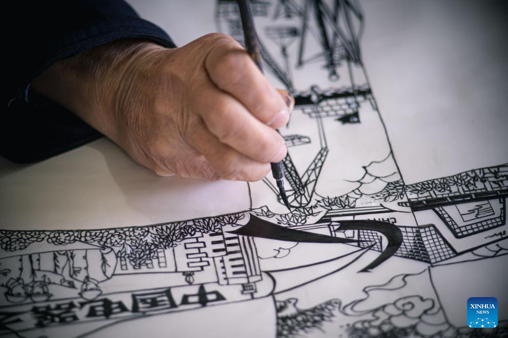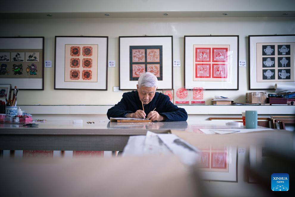 Lu Faliang designs a pattern of paper knife cutting themed on the city view at his studio in Yueqing City, east China's Zhejiang Province, March 12, 2024.(Xinhua/Jiang Han)
