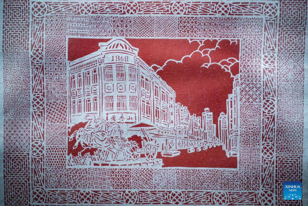 This photo taken on March 12, 2024 shows a paper knife cutting themed on the Wuma Street of Wenzhou displayed at the Yueqing dragon lantern paper knife cutting institute in Yueqing City, east China's Zhejiang Province.(Xinhua/Jiang Han)