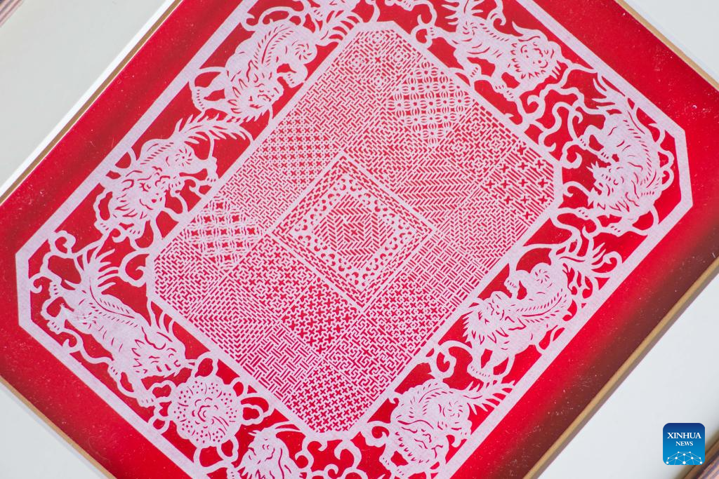 This photo taken on March 12, 2024 shows a part of a paper knife cutting displayed at the Yueqing dragon lantern paper knife cutting institute in Yueqing City, east China's Zhejiang Province.(Xinhua/Jiang Han)