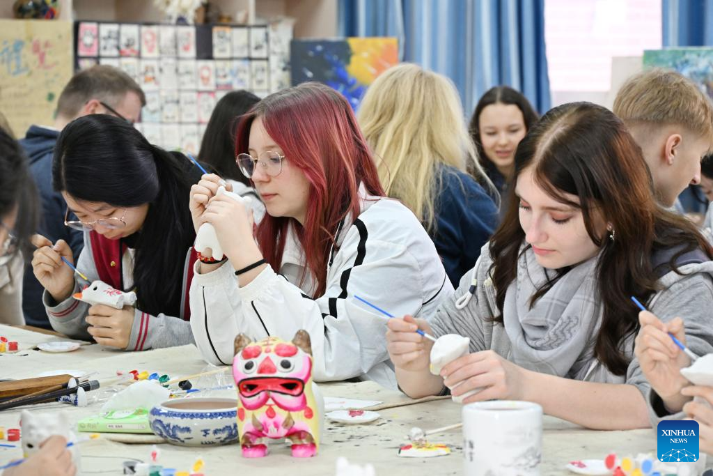 Chinese and German students experience painting "clay tiger" figurines in Qingdao No. 9 High School in Qingdao, east China's Shandong Province, March 21, 2024. High school students from Magdeburg of Germany, who paid a friendly visit to Qingdao No. 9 High School in Shandong Province, experienced making artworks of China's intangible cultural heritages and learned about traditional Chinese culture with Chinese students. (Xinhua/Li Ziheng)