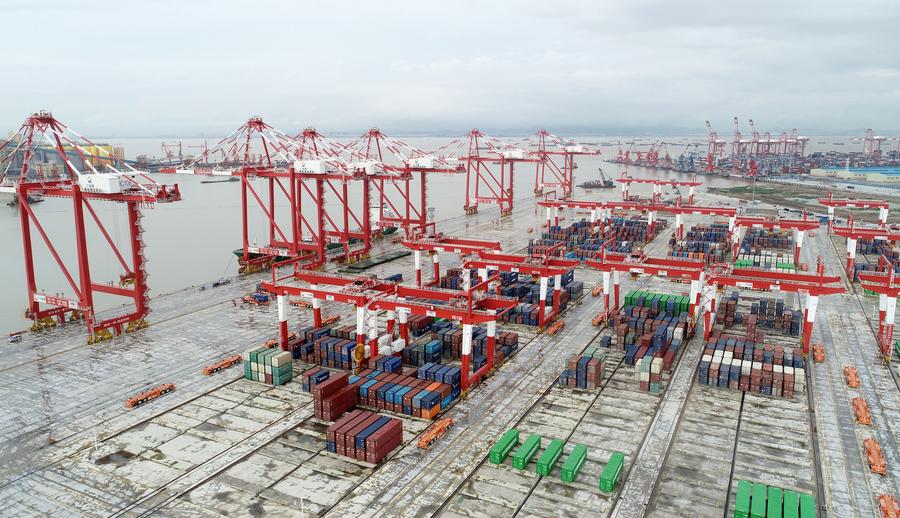 This aerial photo taken on June 16, 2022 shows the fully-automated pier at the Nansha port in Guangzhou, south China's Guangdong Province. (Xinhua/Lu Hanxin)