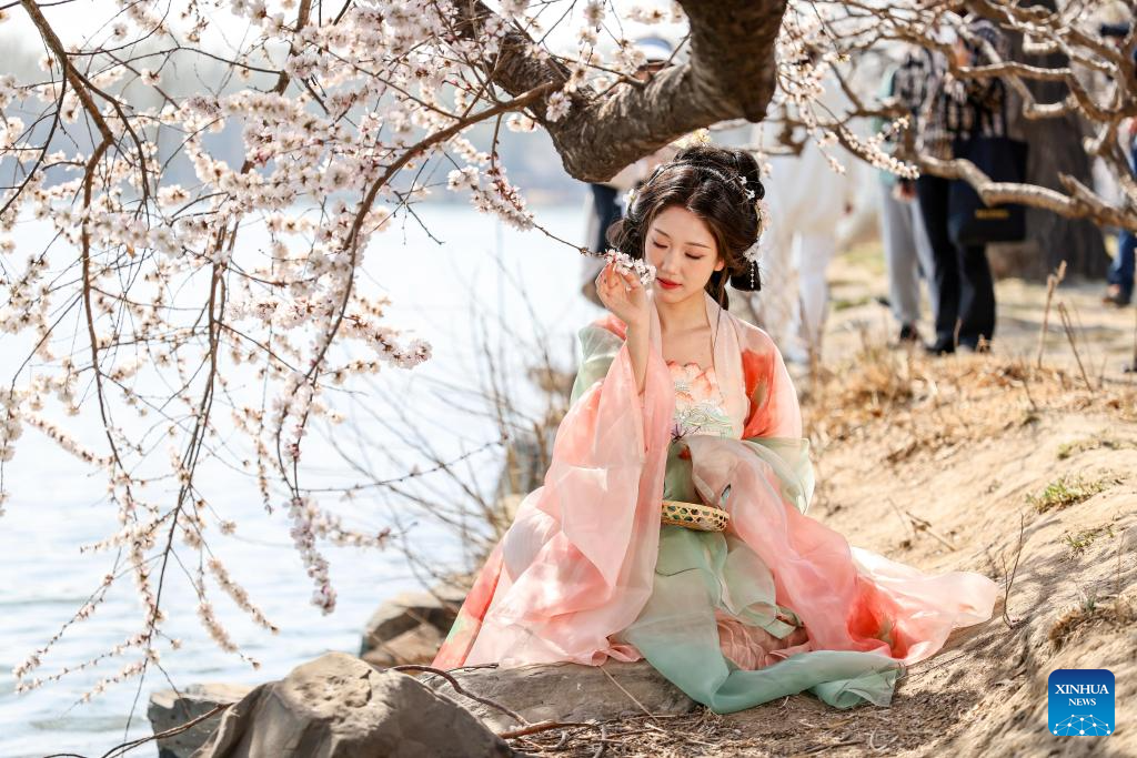 A girl wearing Hanfu, a style of clothing traditionally worn by the Han people, poses for a photo with peach blossoms at the Summer Palace in Beijing, capital of China, March 22, 2024. Recently, spring flowers such as peach blossoms are in full bloom at the Summer Palace in Beijing, attracting a large number of tourists. (Xinhua/Chen Yehua)