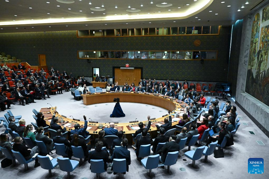 Representatives vote on a draft resolution during a UN Security Council meeting at the UN headquarters in New York, on March 22, 2024. A Chinese envoy said Friday that by setting preconditions for a ceasefire in Gaza, a U.S. draft resolution essentially green-lights continued killing, which is "unacceptable." (Evan Schneider/UN Photo/Handout via Xinhua)