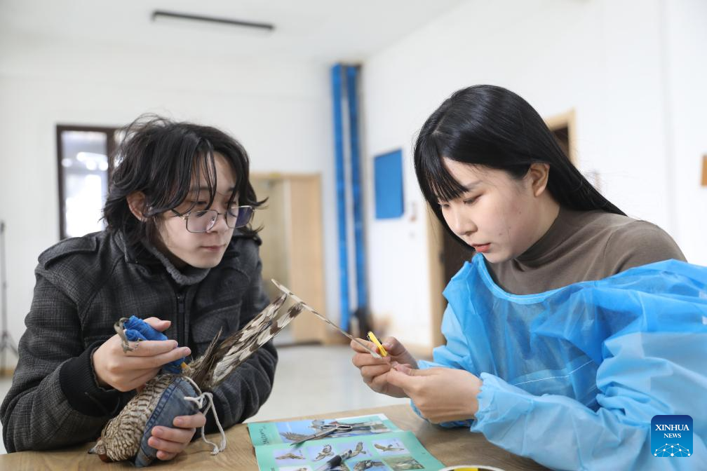 Meng Die (R) splices feathers for an injured sparrow hawk at Shenyang Raptor Rescue Center in Shenyang, northeast China's Liaoning Province, March 23, 2024. (Xinhua/Yang Qing)