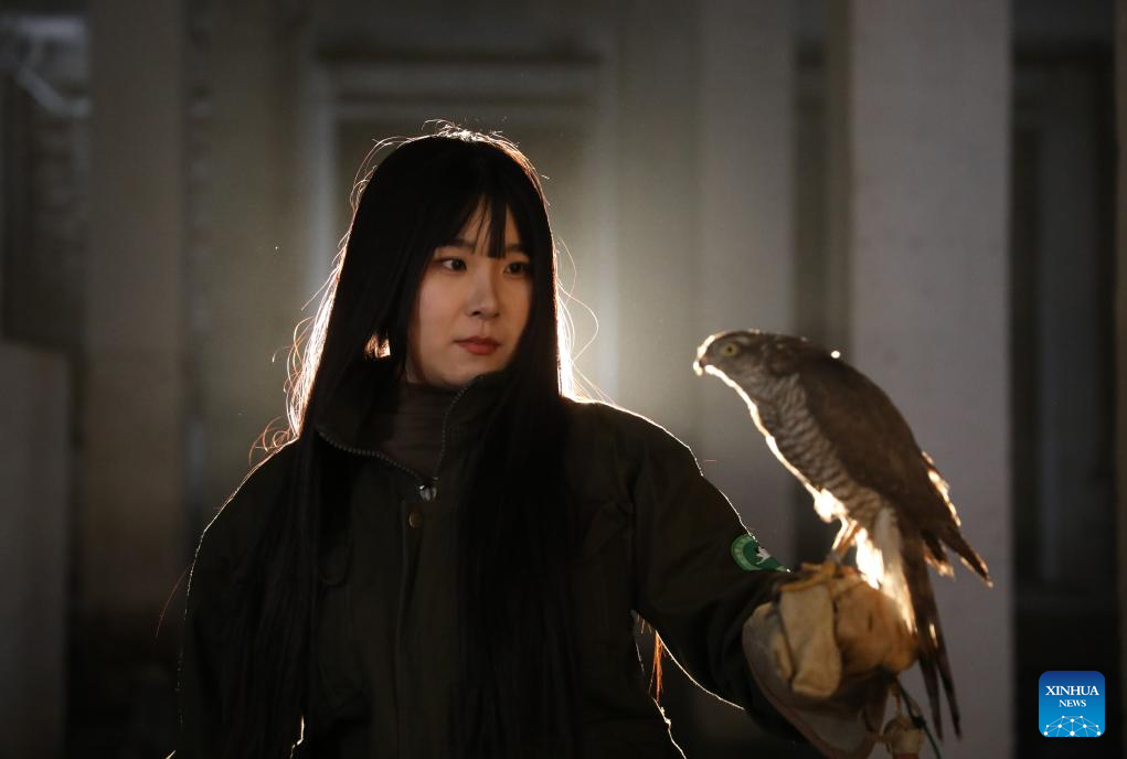 Meng Die poses for a photo with a sparrow hawk she rescued at Shenyang Raptor Rescue Center in Shenyang, northeast China's Liaoning Province, March 23, 2024. (Xinhua/Yang Qing)