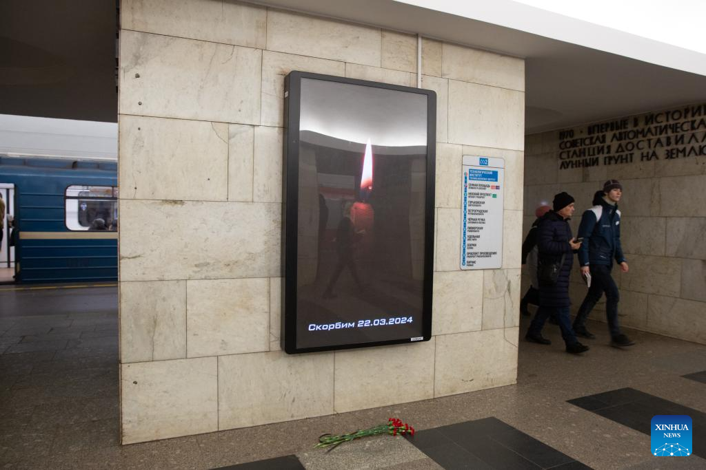 An electronic screen in St. Petersburg metro displays an image mourning for victims of Moscow terrorist attack in St. Petersburg, Russia, March 23, 2024. (Photo by Irina Motina/Xinhua)