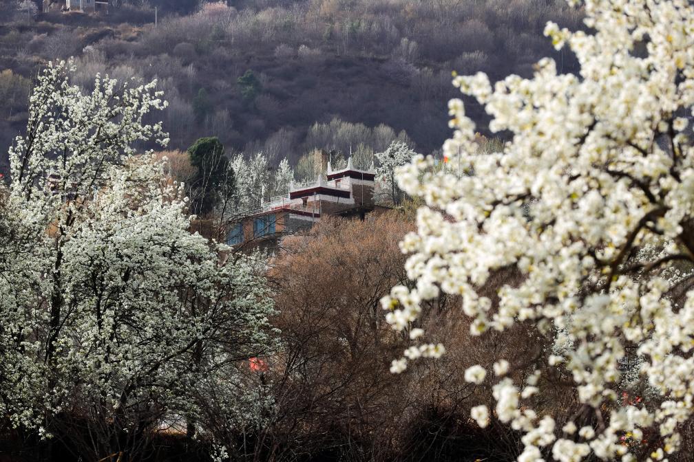 This photo taken on March 23, 2024 shows blooming pear trees and residences of local people in Danba County, Tibetan Autonomous Prefecture of Garze, southwest China's Sichuan Province. (Xinhua/Shen Bohan)