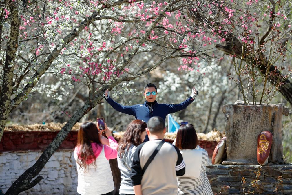 A man poses for photos at a homestay in Danba County, Tibetan Autonomous Prefecture of Garze, southwest China's Sichuan Province, March 23, 2024.(Xinhua/Shen Bohan)