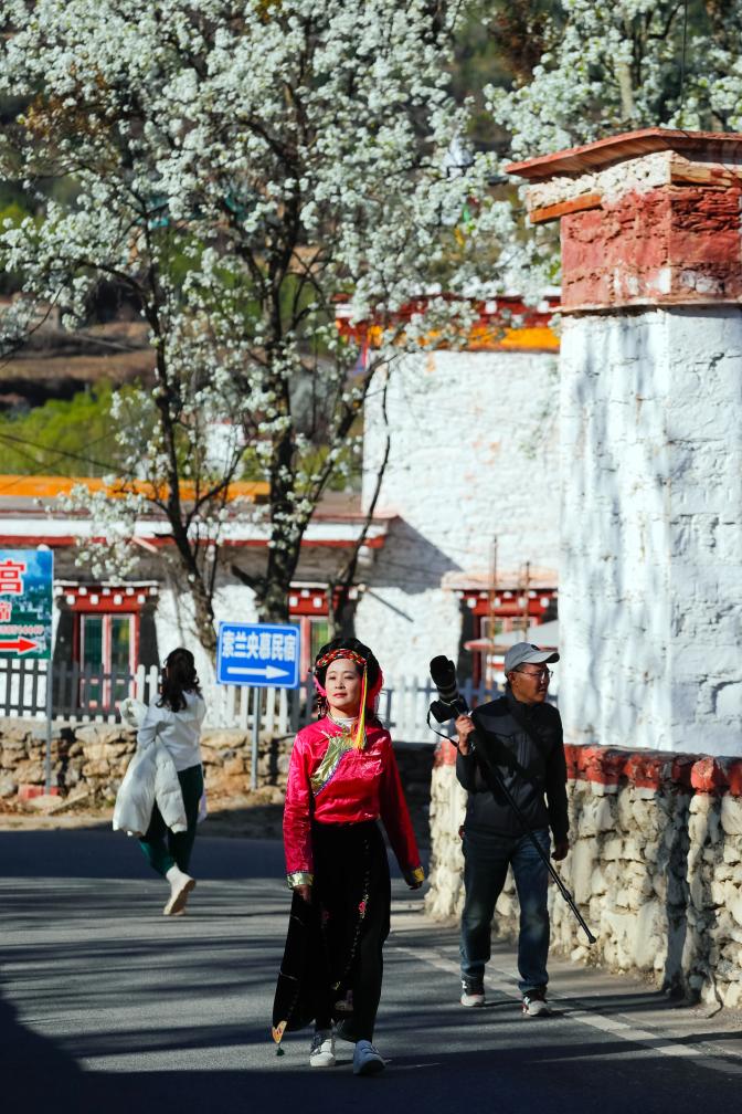 A tourist wearing Tibetan costumes visits a hamlet in Danba County, Tibetan Autonomous Prefecture of Garze, southwest China's Sichuan Province, March 23, 2024. (Xinhua/Shen Bohan)