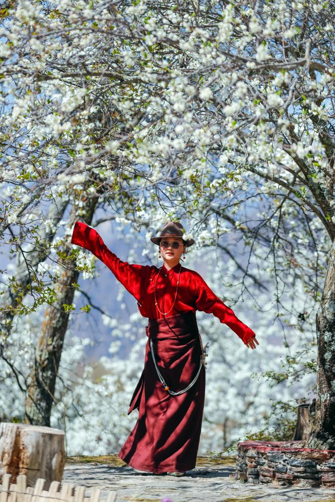 A tourist dances under blooming pear trees at a homestay in Danba County, Tibetan Autonomous Prefecture of Garze, southwest China's Sichuan Province, March 23, 2024.(Xinhua/Shen Bohan)
