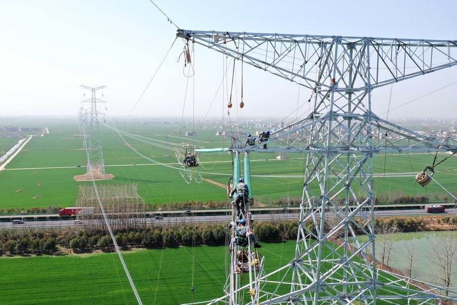This aerial drone photo taken on March 20, 2024 shows electrical workers working at a construction site in Fuyang, east China's Anhui Province. (Xinhua/Liu Junxi)