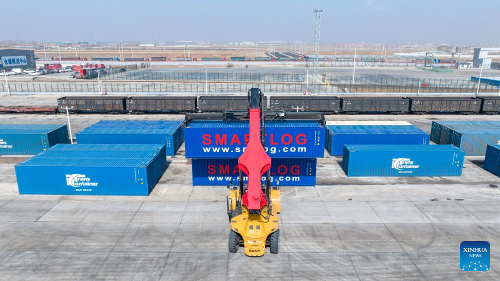 A drone photo taken on March 25, 2024 show a hoisting vehicle transporting a container at the Qisumu international railway logistics hub in Ulanqab, north China's Inner Mongolia Autonomous Region. The Qisumu international railway logistics hub was officially put into operation in 2016. It is the biggest base of China-Europe freight trains in north China's Inner Mongolia Autonomous Region. A total of 745 outbound freight trains have been handled by the hub since its operation. The China-Europe freight train services handled by the hub currently reach 16 cities in Europe and Asia. (Xinhua/Lian Zhen)