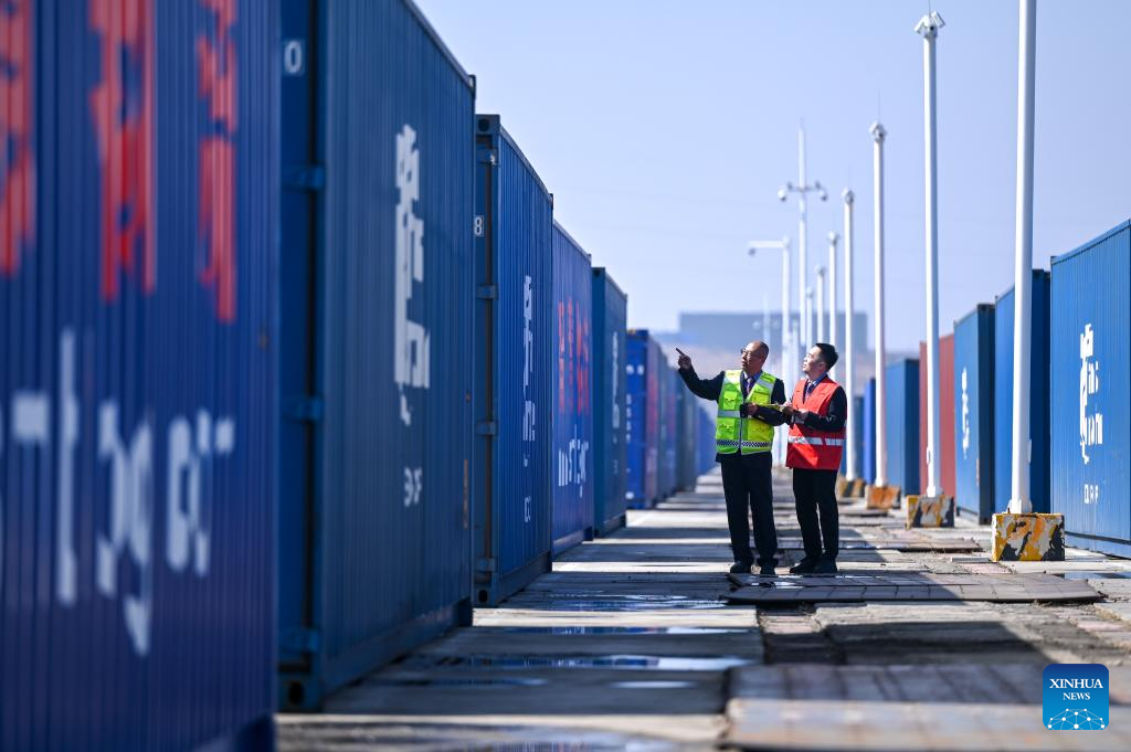 Staff members check the containers at the Qisumu international railway logistics hub in Ulanqab, north China's Inner Mongolia Autonomous Region, on March 25, 2024. The Qisumu international railway logistics hub was officially put into operation in 2016. It is the biggest base of China-Europe freight trains in north China's Inner Mongolia Autonomous Region. A total of 745 outbound freight trains have been handled by the hub since its operation. The China-Europe freight train services handled by the hub currently reach 16 cities in Europe and Asia. (Xinhua/Lian Zhen)