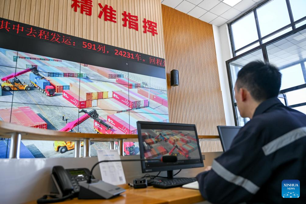 A staff member works at the control room of the Qisumu international railway logistics hub in Ulanqab, north China's Inner Mongolia Autonomous Region, on March 25, 2024. The Qisumu international railway logistics hub was officially put into operation in 2016. It is the biggest base of China-Europe freight trains in north China's Inner Mongolia Autonomous Region. A total of 745 outbound freight trains have been handled by the hub since its operation. The China-Europe freight train services handled by the hub currently reach 16 cities in Europe and Asia. (Xinhua/Lian Zhen)