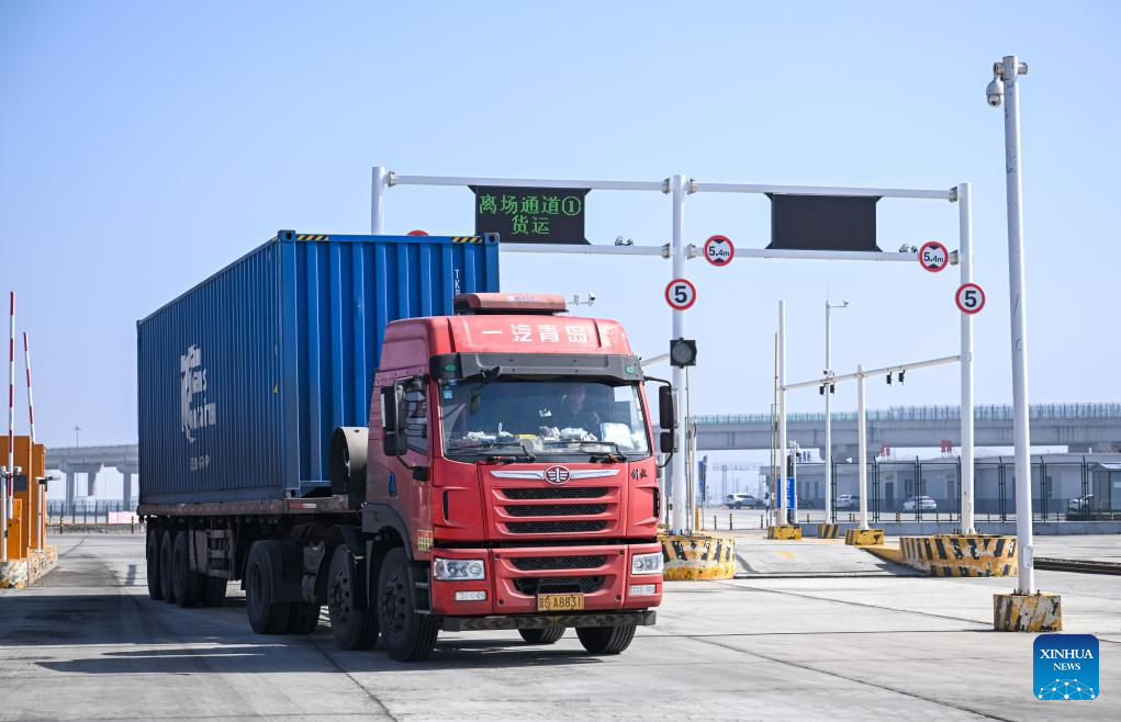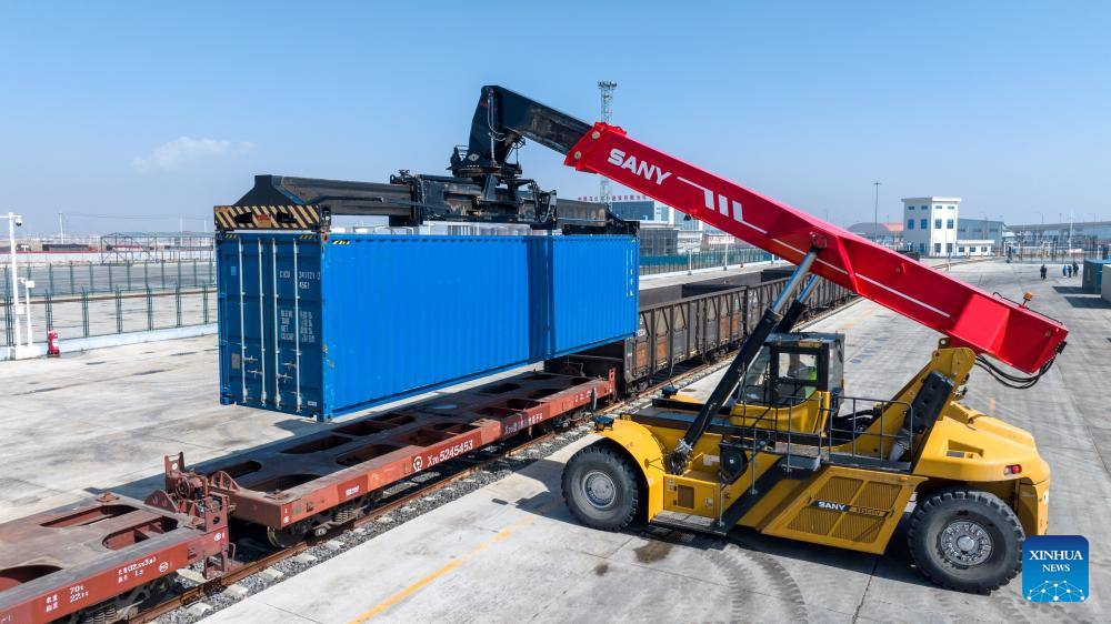 This photo taken on March 25, 2024 show a truck transporting a container at the Qisumu international railway logistics hub in Ulanqab, north China's Inner Mongolia Autonomous Region. The Qisumu international railway logistics hub was officially put into operation in 2016. It is the biggest base of China-Europe freight trains in north China's Inner Mongolia Autonomous Region. A total of 745 outbound freight trains have been handled by the hub since its operation. The China-Europe freight train services handled by the hub currently reach 16 cities in Europe and Asia. (Xinhua/Lian Zhen)