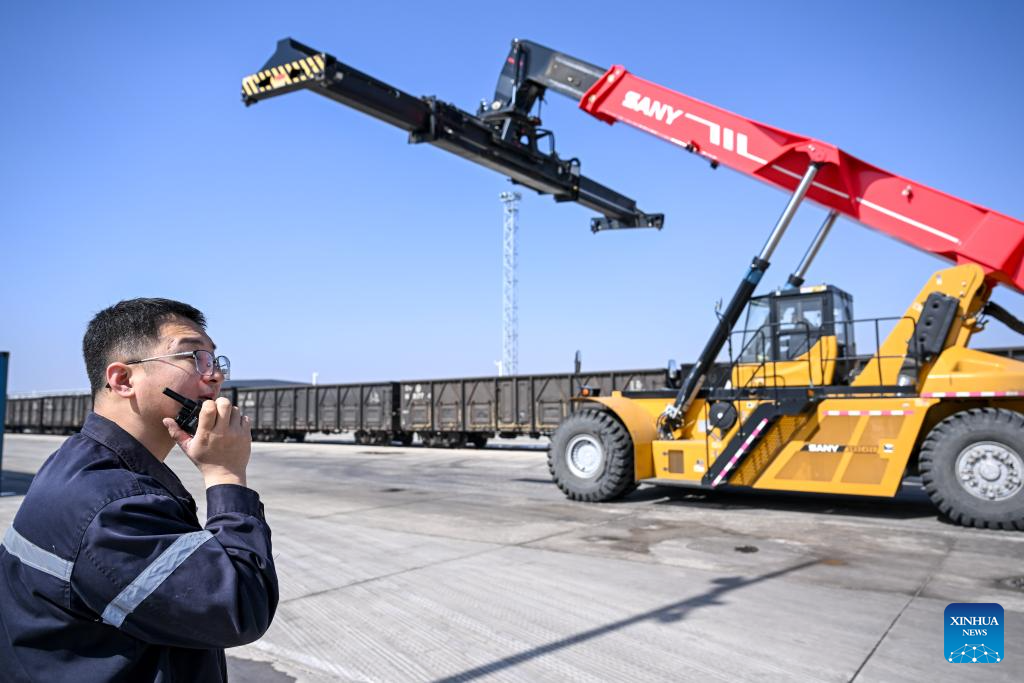 A staff member works at the Qisumu international railway logistics hub in Ulanqab, north China's Inner Mongolia Autonomous Region, on March 25, 2024. The Qisumu international railway logistics hub was officially put into operation in 2016. It is the biggest base of China-Europe freight trains in north China's Inner Mongolia Autonomous Region. A total of 745 outbound freight trains have been handled by the hub since its operation. The China-Europe freight train services handled by the hub currently reach 16 cities in Europe and Asia. (Xinhua/Lian Zhen)