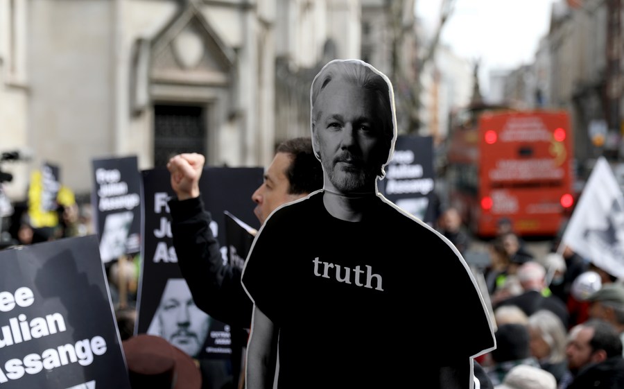Supporters of WikiLeaks founder Julian Assange take part in a protest outside the High Court in London, Britain, on March 26, 2024. (Xinhua/Li Ying)