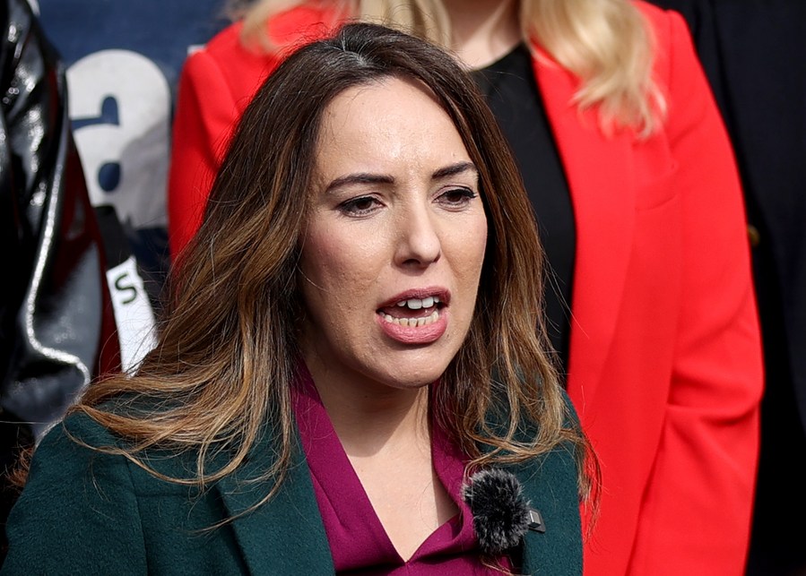 WikiLeaks founder Julian Assange's wife Stella Assange takes part in a protest outside the High Court in London, Britain, on March 26, 2024. (Xinhua/Li Ying)